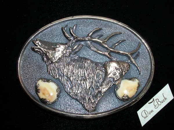 Custom Rocky Mountain Elk bronze belt buckle cast in bronze with client’s elk ivories by wildlife bronze sculptor Don Beck
