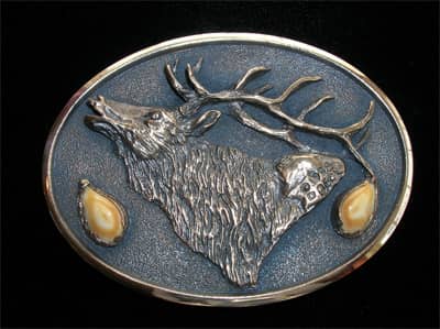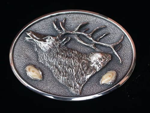 The Rocky Mountain Elk belt buckle shown here in sterling silver is one of the Custom made elk buckles using clients elk ivories by bronze sculptor Don Beck